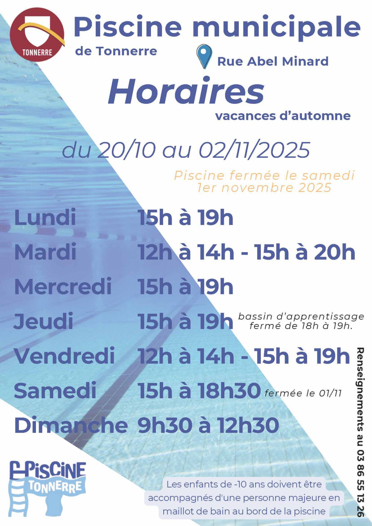 École de nage (de 6 à 11 ans - savoir nager 25 m) : mercredi et samedi de 14h à 15h ;