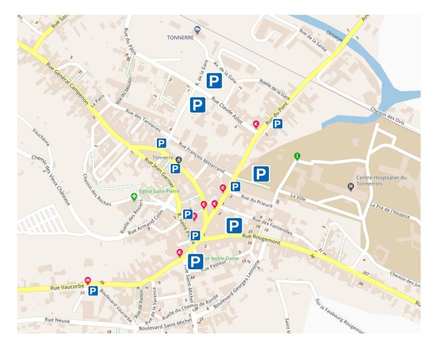 Quels emplacements de stationnement spécifiques identifiés en centre-ville ?
